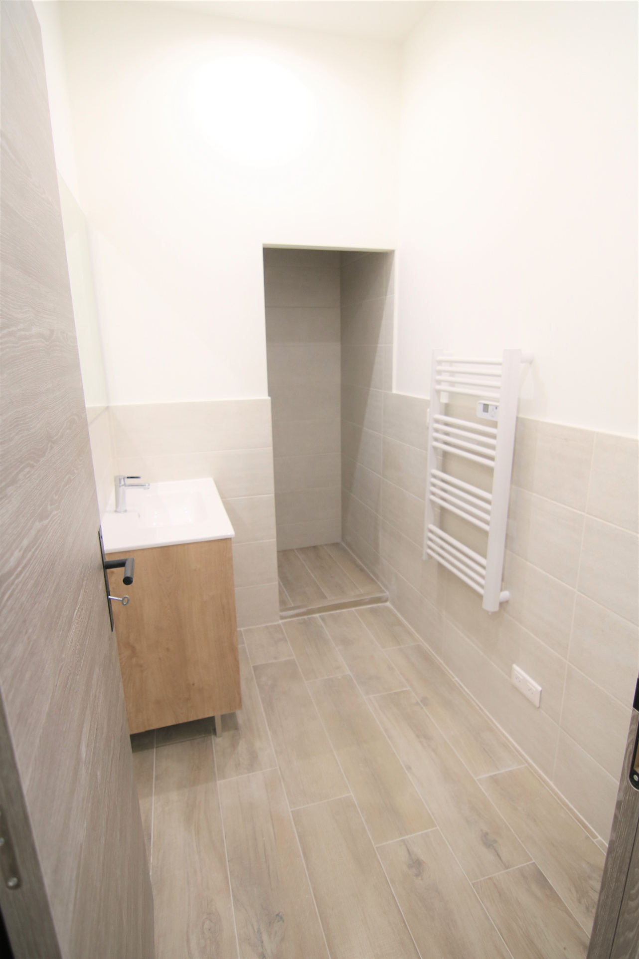 - Une salle d'eau avec douche et chauffe serviette