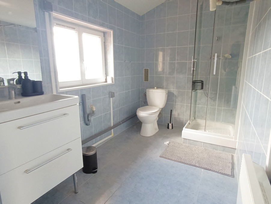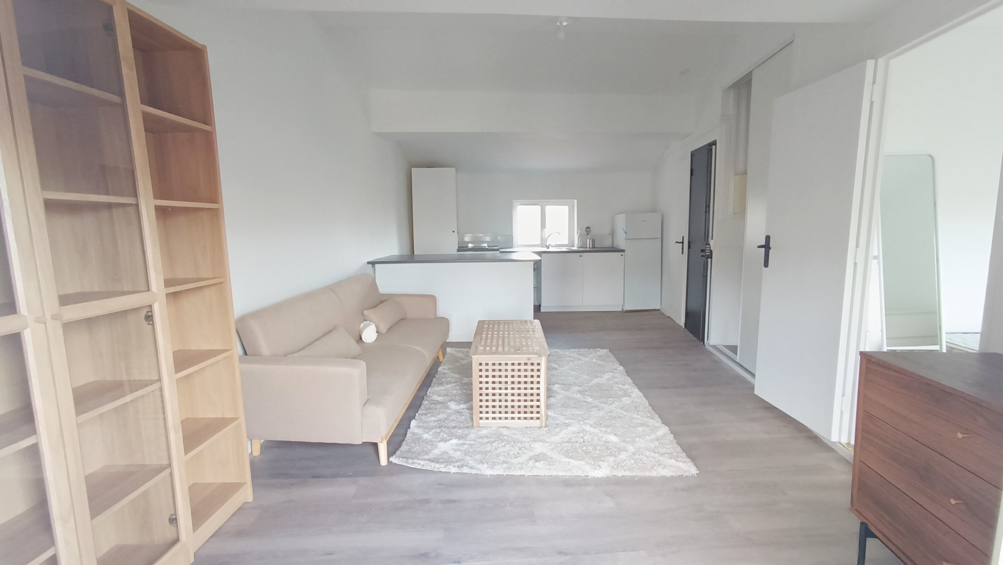 - Une pièce principale avec ilot cuisine, canapé et rangements